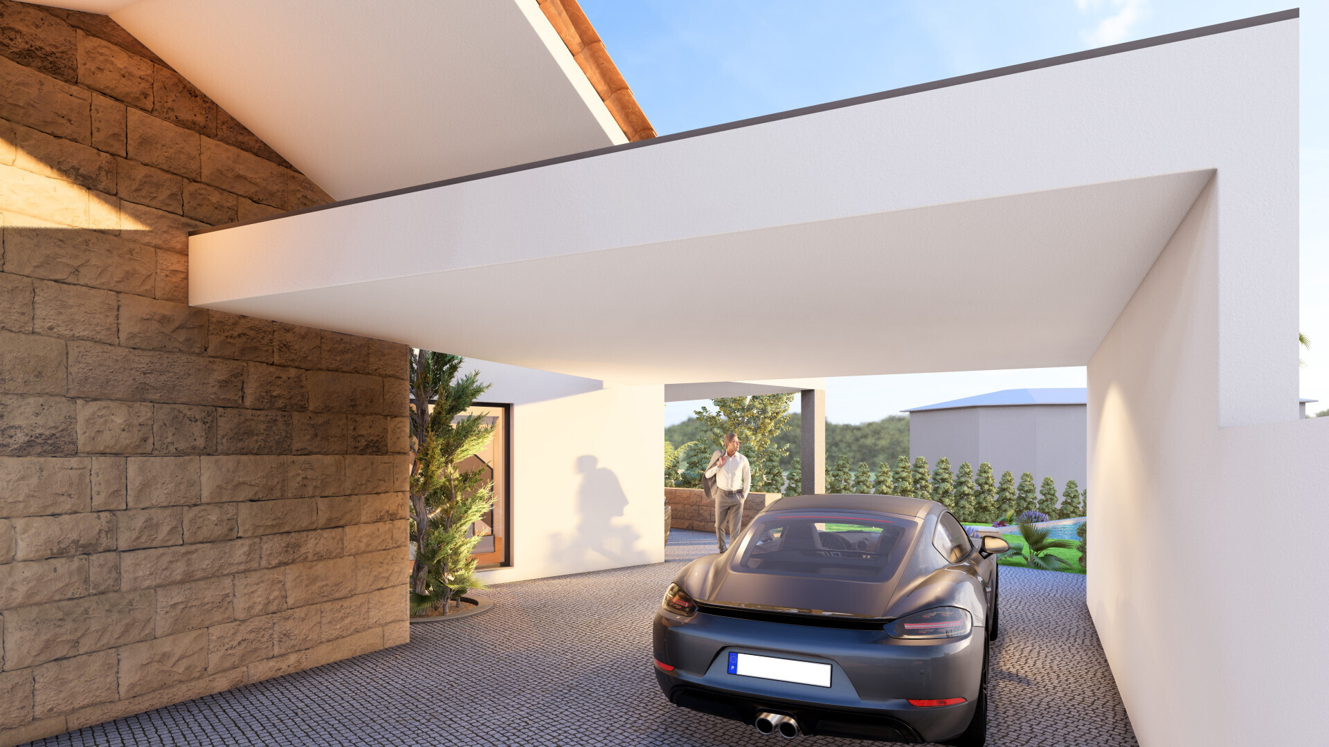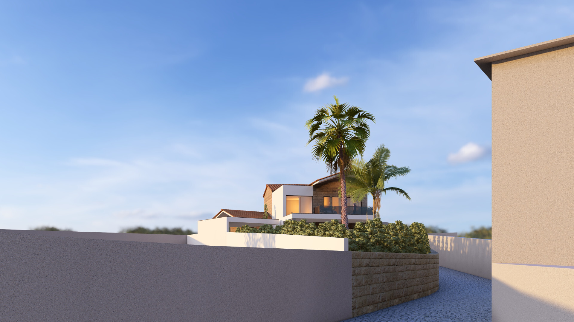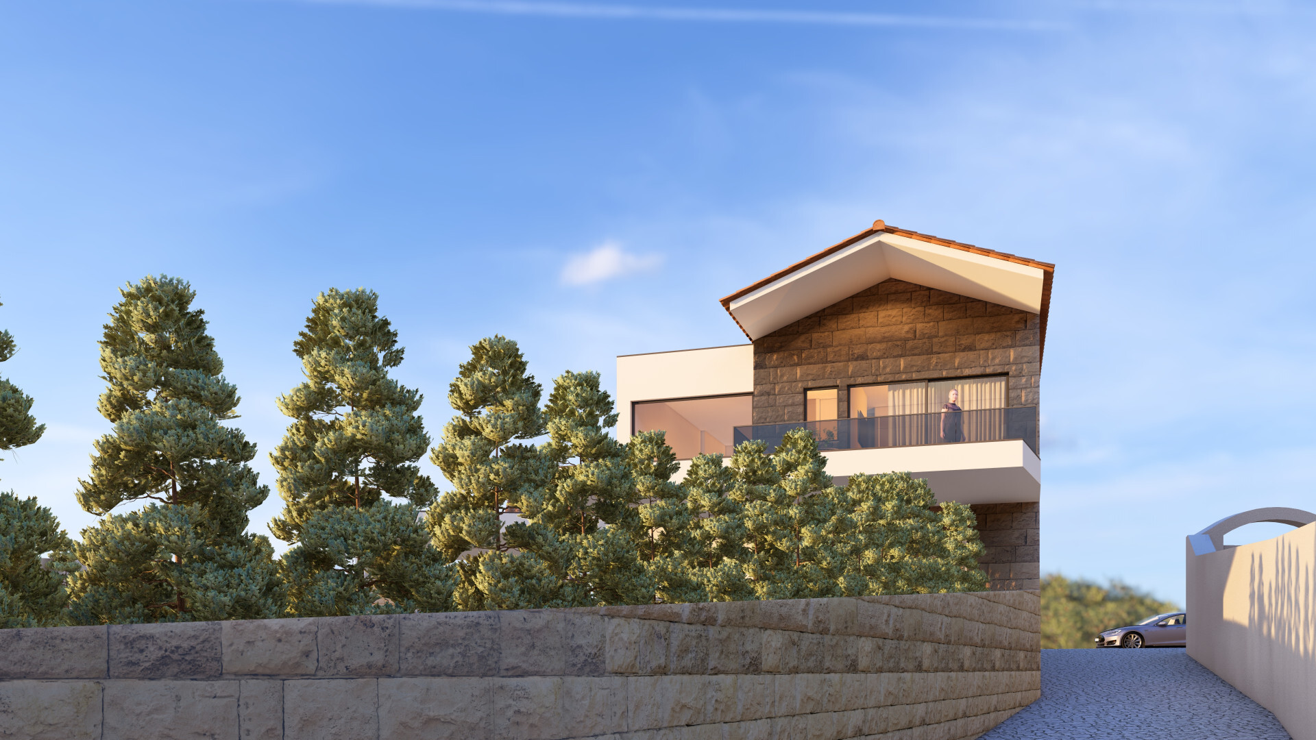 Moradia T4 de arquitetura contemporânea, implantada num lote de 438 m², onde o design moderno se conjuga com a valorização de uma ruína existente, preservando a identidade do local e criando um projeto único e cheio de carácter.