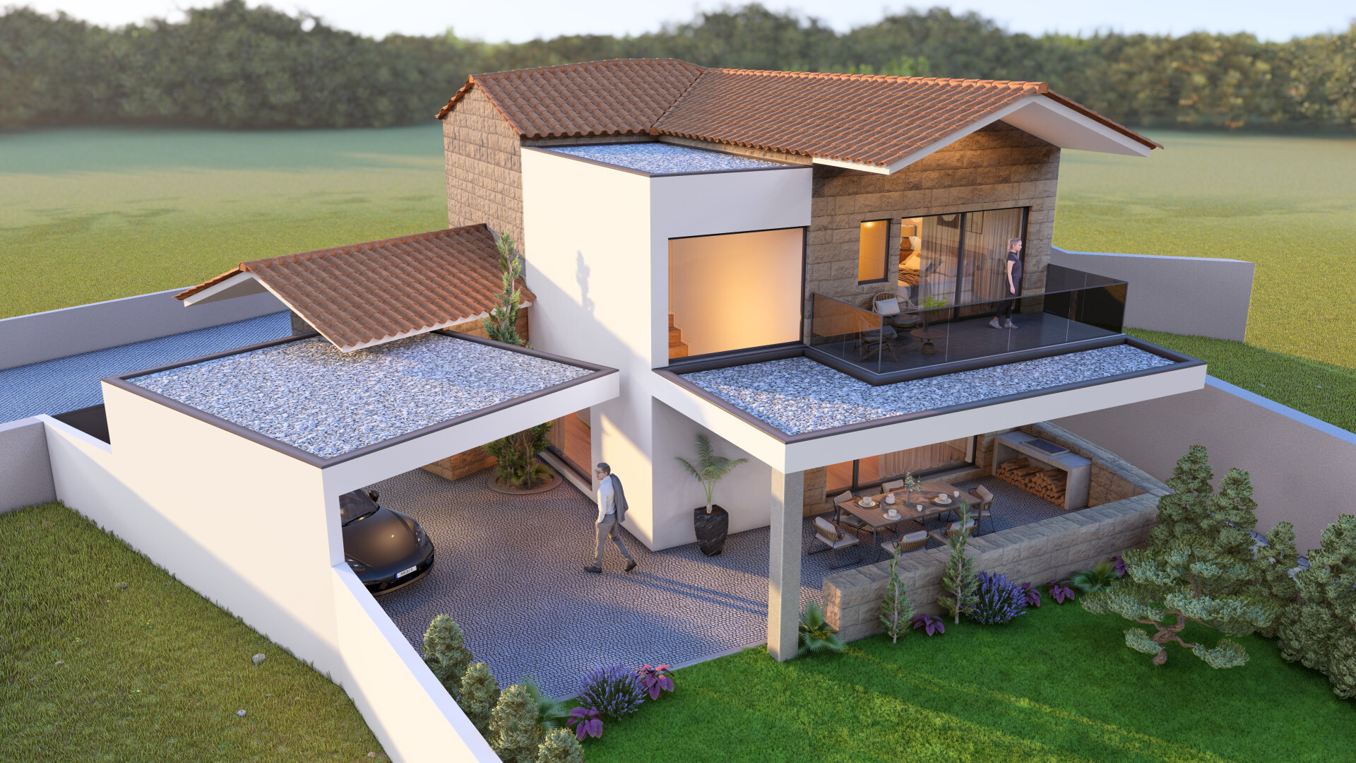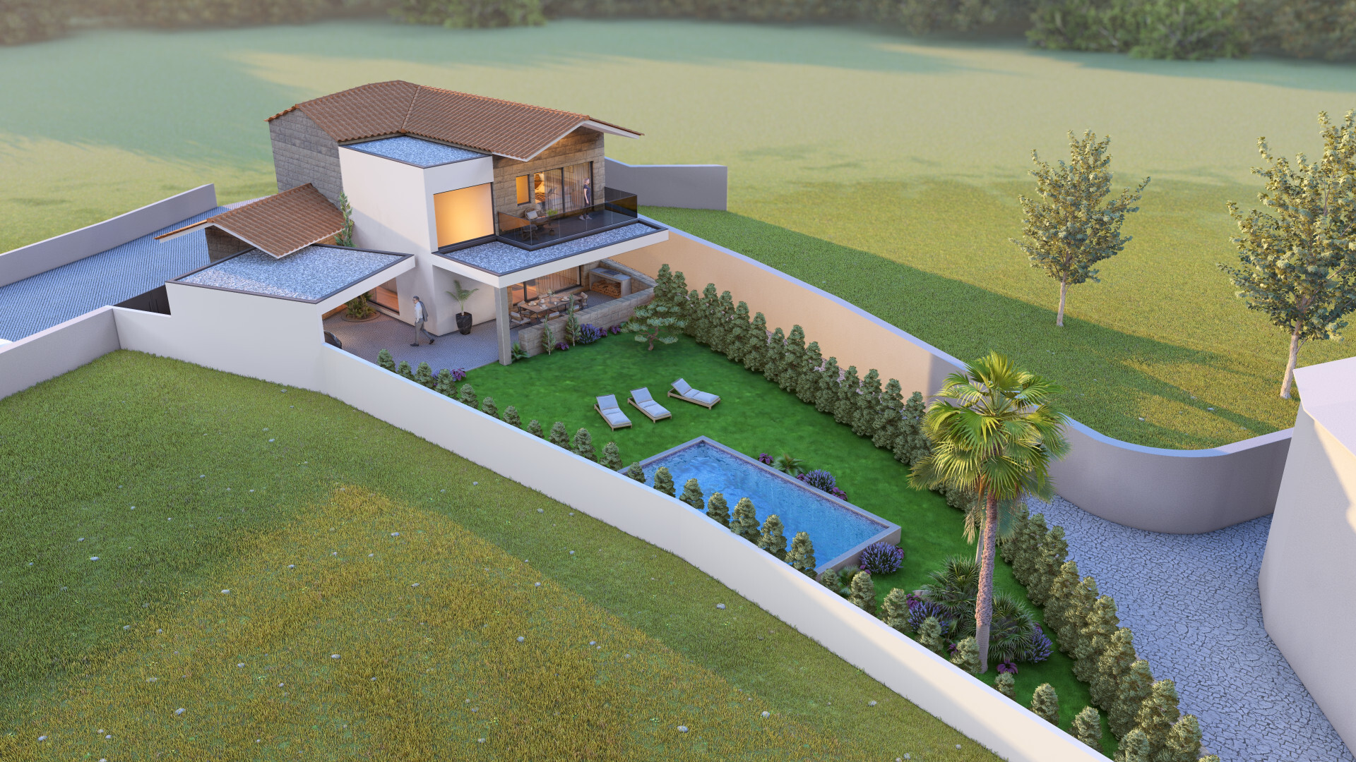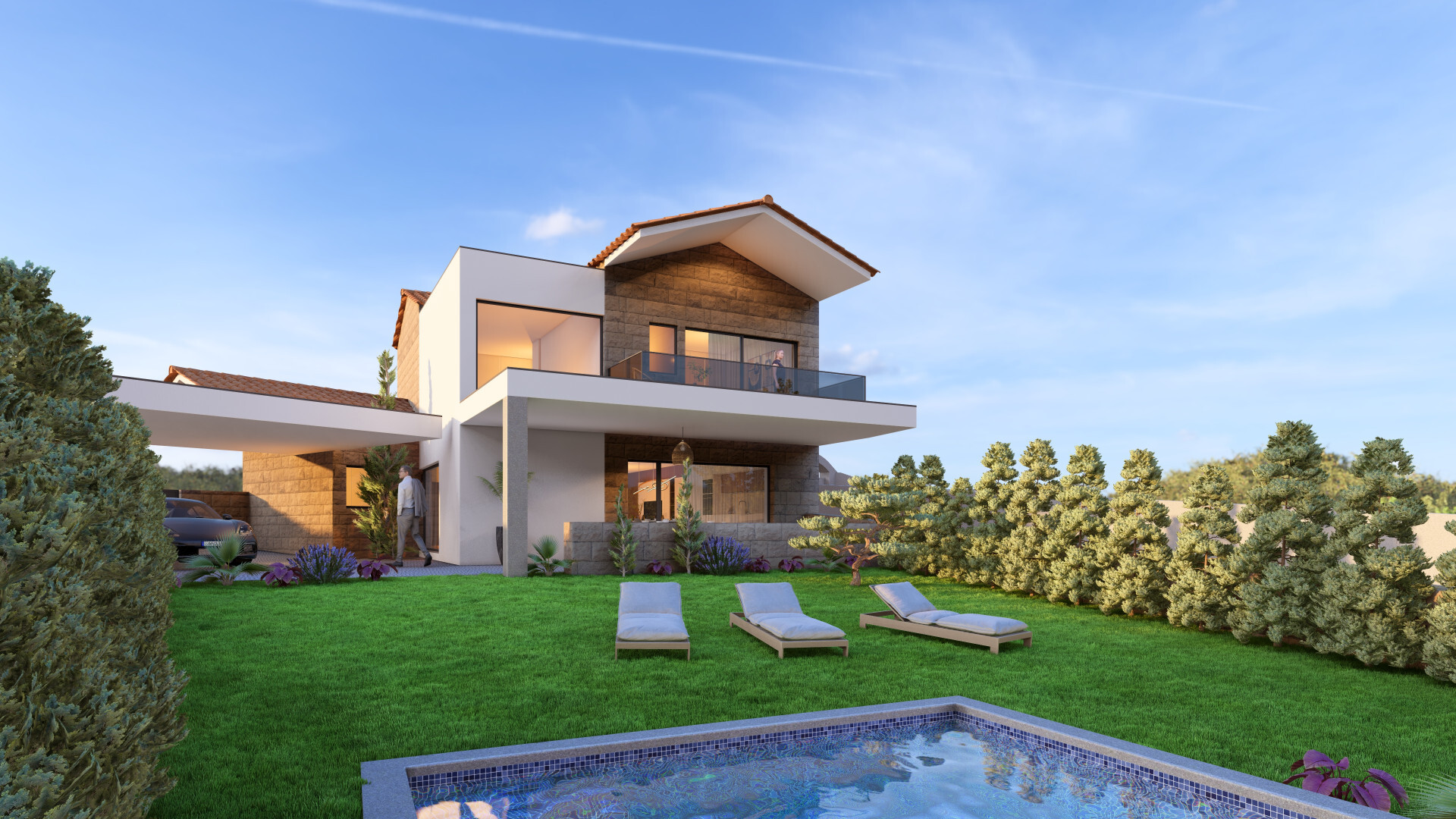 Distribuída por dois pisos, a moradia destaca-se pelas suas amplas áreas envidraçadas e excelente luminosidade natural, proporcionando uma ligação fluida entre os espaços interiores e o exterior.